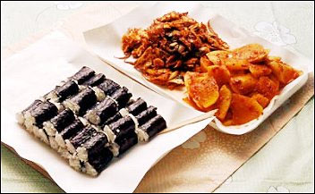 統営キンムプは長く置いておいても味が変わらぬよう、海苔にご飯だけを入れるのが特徴で(韓国の海苔巻は普通、色々な具を入れて巻きます)、大根キムチとイカの辛い和えものをおかず代りにつまみながら食べます。