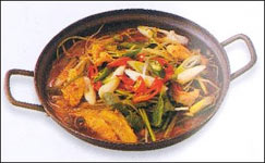 海域で生産されるフグにせりや大豆もやしなどを入れて煮た、辛い鍋物です。