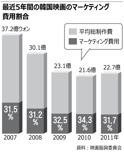 韓国映画の広報・マーケティング費用が制作費全体の3分の1を占めている実態が映画振興委員会の資料で明らかになった。2007年から昨年まで5年間の韓国映画の平均制作費を見ると、マーケティング費用の割合が毎年30%を超えた。同委関係者は「今年のデータは年末に集計するが、数値に大きな変動はないだろう」と話した。
