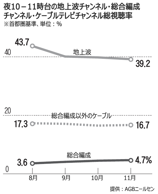 視聴率調査機関AGBニールセン・メディア・リサーチが19日に発表したところによると、同時間帯の地上波3局が記録した視聴率の合計は8月43.7%、9月40.1%、10月39.8%、11月39.2%(いずれも首都圏基準)と下降傾向を示していたという。約3カ月間に4.5ポイントが「消えた」ということだ。