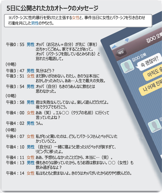 メッセージには、これまでのパク・シフ側の主張と食い違う内容が含まれている。パク・シフ側は「女性は酒に酔っておらず、互いに好感を抱き性関係を持った」と、合意の上だったことを主張してきた。だが、公開されたメッセージによると、事件当日の先月15日午後3時51分、女性は「まだ酔いがさめない」と記している。パク・シフや後輩の男性と酒を飲んでから12時間たっても酒が抜けないほど酔っていたことになる。また、この女性は午後4時過ぎ「(自分が)パク・シフさんとベッドにいて驚いた」「予想もしなかったこと」といったメッセージを送っている。