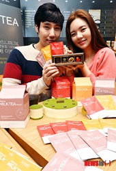 ソウル市中区のロッテ百貨店本店で11日午前、モデルたちが、プレミアム緑茶ブランド「OSULLOC」の新商品「ミルクティーハウス」をPRした。