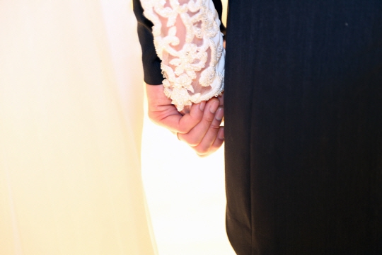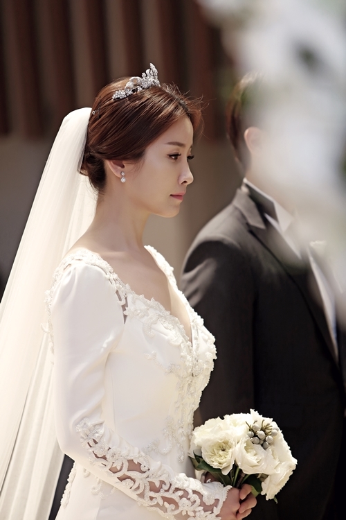 写真のイ・テランは流れるようなラインのウエディングドレスを着ている。このドレスは、先がレースになった長い袖やスカート部分が体にフィットし、美しく優雅なシルエットを作り出している。