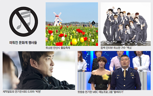 映画・放送・音楽・ミュージカル界も同様だ。映画『人間中毒』は17日に予定されていた制作発表会を延期し、ZE:Aイム・シワンや少女時代サニーが吹き替えをしたアニメ映画『Rio2』のVIP試写会事前イベントも先送りされた。18日に予定されていたリュ・スンリョン主演映画『標的』のショーケース、歌手BoAのハリウッド進出作『Make Your Move』のプロモーションのインタビューもすべて延期された。