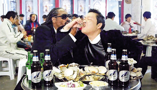 ▲PSYが9日にリリースした新曲「Hangover」のミュージックビデオで、世界的なヒップホップ・スター、Snoop Doggと一緒に焼酎の「ラブショット」をするシーン。写真=ユーチューブより