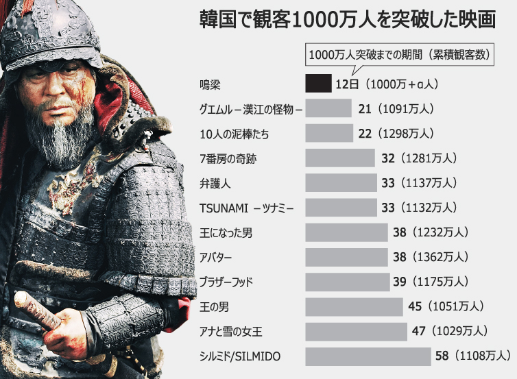 韓国映画『鳴梁』(キム・ハンミン監督)が公開12日目の10日、累計観客動員数1000万人を突破した。これは観客1000万人達成の過去最速記録で、『グエムル-漢江の怪物-』(2006年)が公開21日目で1000万人に達した記録を9日も縮めたものだ。しかも、観客動員数1位の米国映画『アバター』(同38日目)、『7番房の奇跡』(同32日目)、『王になった男』(同38日目)、『弁護人』(同33日)が10..