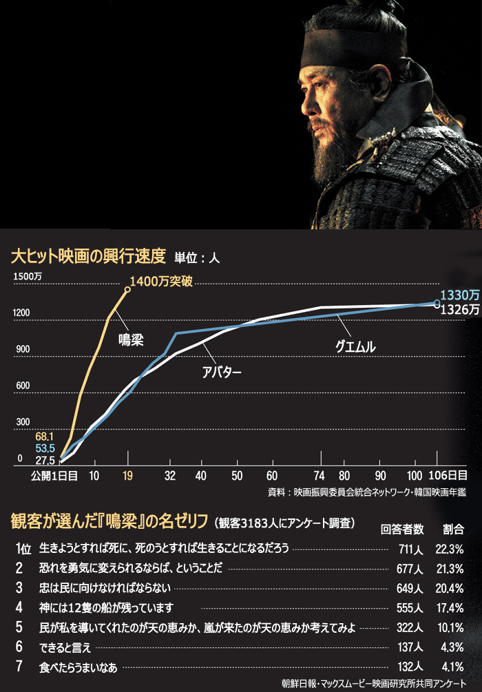 『鳴梁』の興行速度は過去最高の興行映画『アバター』、2位の『グエムル-漢江の怪物-』に比べ2倍以上も速い。『鳴梁』が最多観客動員数を更新したのは公開18日目だが、同じ時点で『アバター』は663万人、『グエムル』は774万人の動員だった。観客1300万人を超えるまでにかかった時間は『鳴梁』が17日間、『アバター』は74日間だ。
