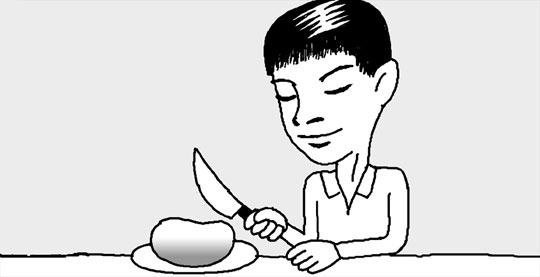 上の部分がカリっとしていたり硬かったりして切りにくいパンは、裏返してから切れば、つぶれることなくきれいに切れる。
