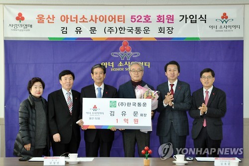 【蔚山聯合ニュース】女優キム・テヒさんの父である韓国通運のキム・ユムン会長が高額寄付者の集まり「オナー・ソサエティー(Honor Society)」に加入した。社会福祉法人、蔚山社会福祉共同募金会で11日に加入式が行われた。