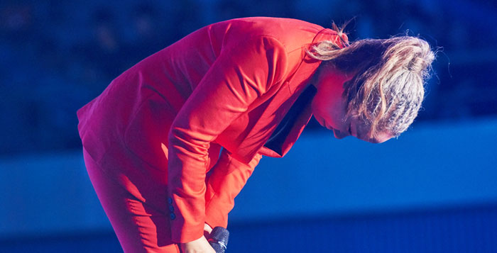 10日午後6時、京畿道議政府市内の議政府体育館で開かれるはずだった「米第2師団創設100周年記念コンサート」。1階から3階まで満員になった観客3500人がざわめいた。このコンサートでオープニングを飾る予定だったベテラン歌手のインスニは赤いスーツを着てステージに登場したが、歌わずに頭を下げ続けた。そして、「申し訳ございません」と言い残してステージを去った。