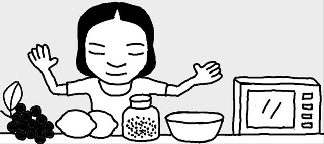 容器に冷凍ブルーベリーと砂糖を2:1の割合で入れたところにレモン汁を半個分混ぜてから電子レンジで7-8分ずつ2回ぐらい加熱すると、簡単にジャムを作ることができる。