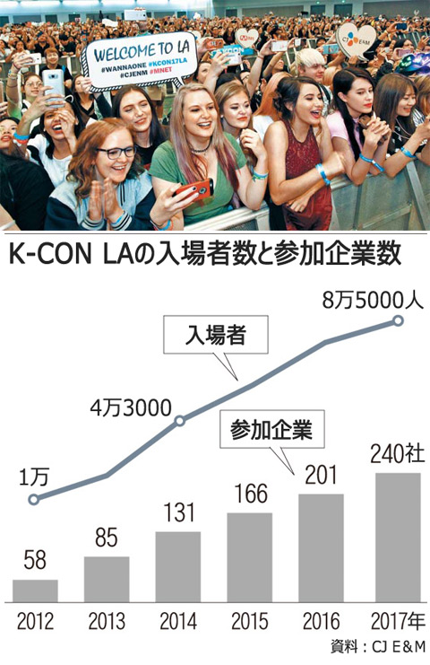 18日から20日までロサンゼルス・コンベンション・センターとステイプルズ・センターで韓国文化コンテンツ展示会「K-CON LA 2017」が開催された。今年のK-CON LAにはトヨタやステートファームのほか、米国2位の移動通信会社AT&T、韓国のLG電子や錦湖アシアナなどスポンサー企業69社と中小企業170社以上が参加した。入場者は8万5000人に達し、過去最大規模を記録した。エンターテインメント大手企業のCJ E&M関係者は「今回のK-CON LAとK-CON NYの売上は105億ウォン(約10億円)、営業利益は5億ウォン(約4800万円)を記録、初めて黒字を出した。単なるプロモーションではなく、本格的な収益事業として定着しつつある」と言った。
