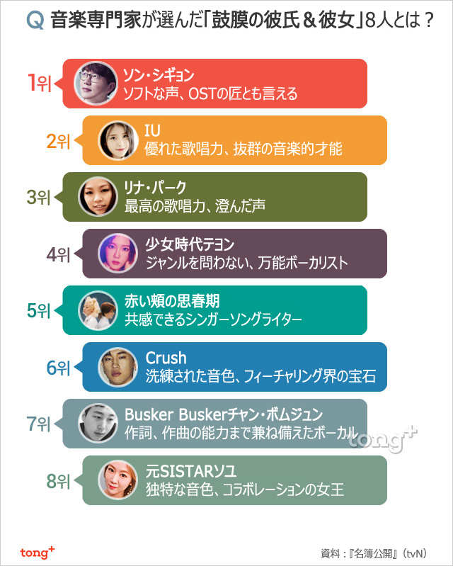 スターの全てを興味深いランキングで紹介する番組『名簿公開』(tvN)では、音楽専門家が選んだ「鼓膜の彼氏&彼女」8人を発表。優れた歌唱力を誇り、作詞はもちろん作曲までしてしまう、甘い声が魅力的な歌手は誰だろうか。