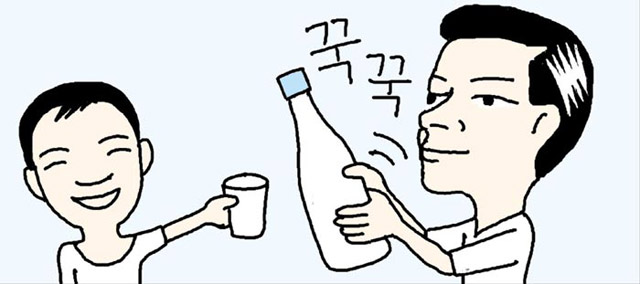 マッコリを注ぐ時にあふれないようにするには、上下に振った後、瓶を回しながら押す。そうすると瓶に圧力が加わって泡が割れ、あふれにくくなる。