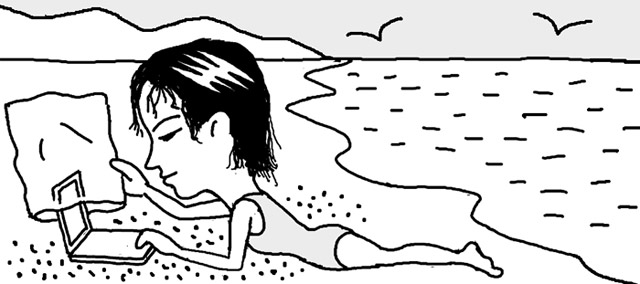 ビーチでタブレットPCを使って読書する時は、ファスナー付きビニール袋に入れておくと、砂が入らない。