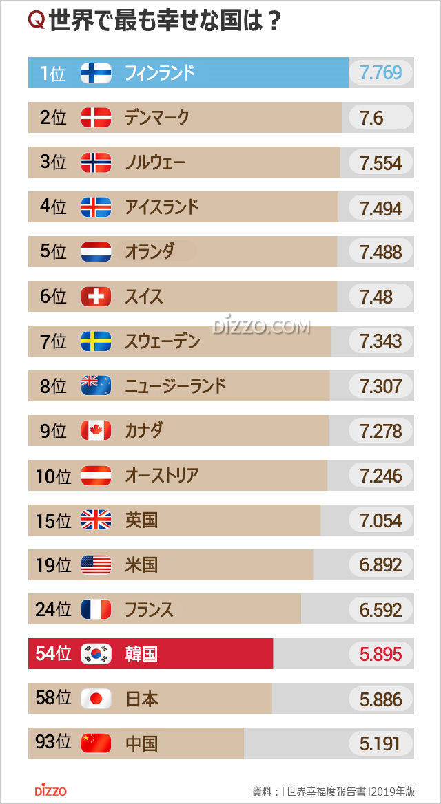 国連が3月20日に発表した2019年の世界幸福度ランキングでフィンランドが1位になった。最下位は南スーダンだった。