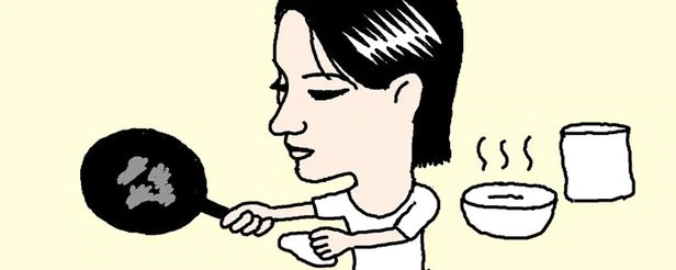 フライパンの油汚れは、水と砂糖を1対1で混ぜた砂糖水をウェットティッシュに含ませてそっとふくと、砂糖が油の粒子を吸着して楽に汚れが落ちる。