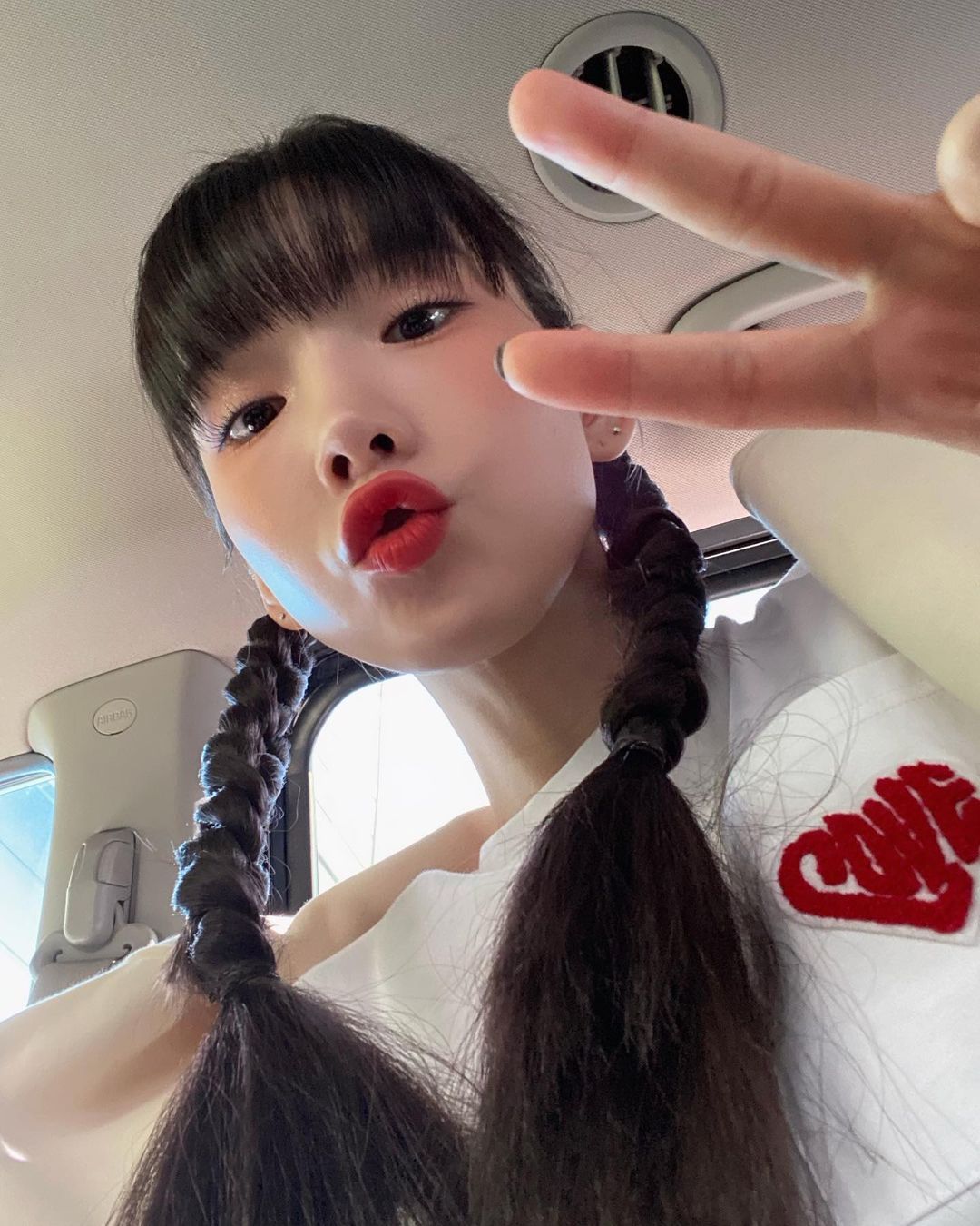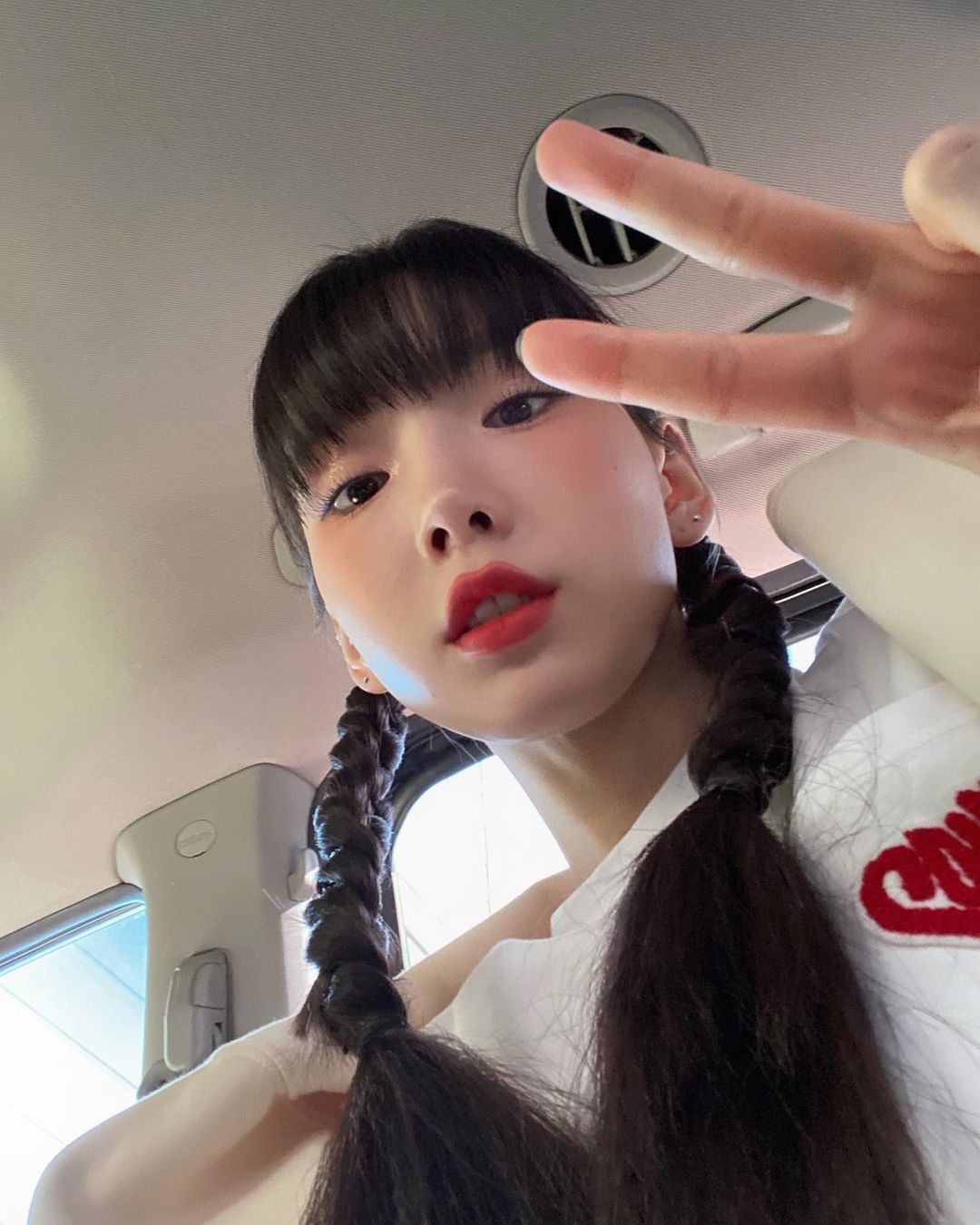 写真のテヨンはカメラを下に置いて、自撮りしている。屈辱的なショットになりがちなアングルだが、テヨンは人形のように完ぺきなビジュアルだ。