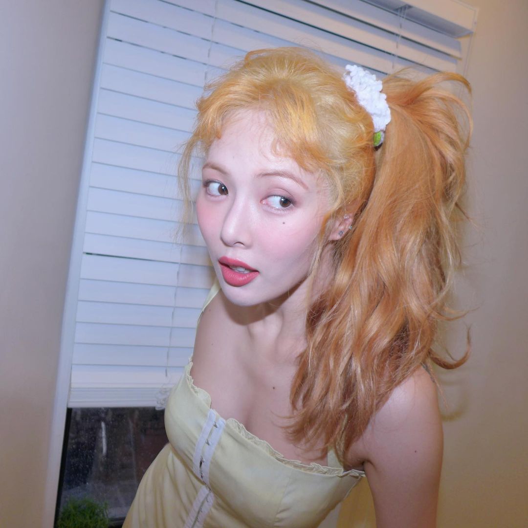 写真でヒョナは、これまでの赤い髪ではなく金髪に変身している。イエローのチューブトップと華やかなメークが春の雰囲気を存分に漂わせている。