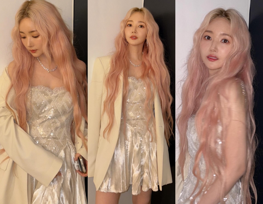 写真でパク・ミニョンは、ピンク系の明るいカラーのロングヘアをおろし..
