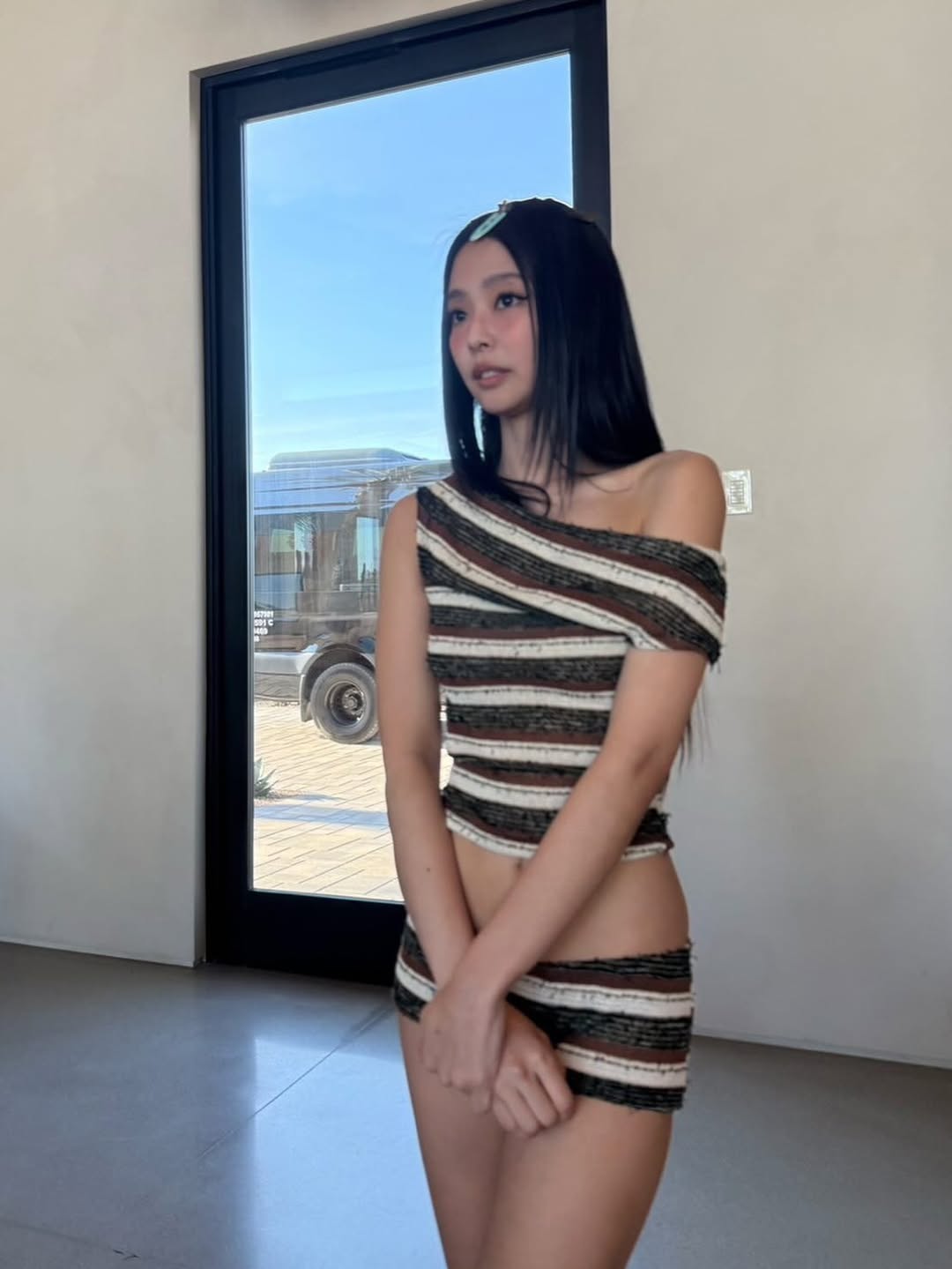 公開された写真を見ると、ジェニーはクロップドトップスにホットパンツという、ボディラインにフィットするアイテムを身に着け、スレンダーボディを誇っている。髪をいくつものピンでとめ、魅力的なスタイリングを披露したジェニー。長いストレートヘアをおろしたまま、ダンスも踊った。