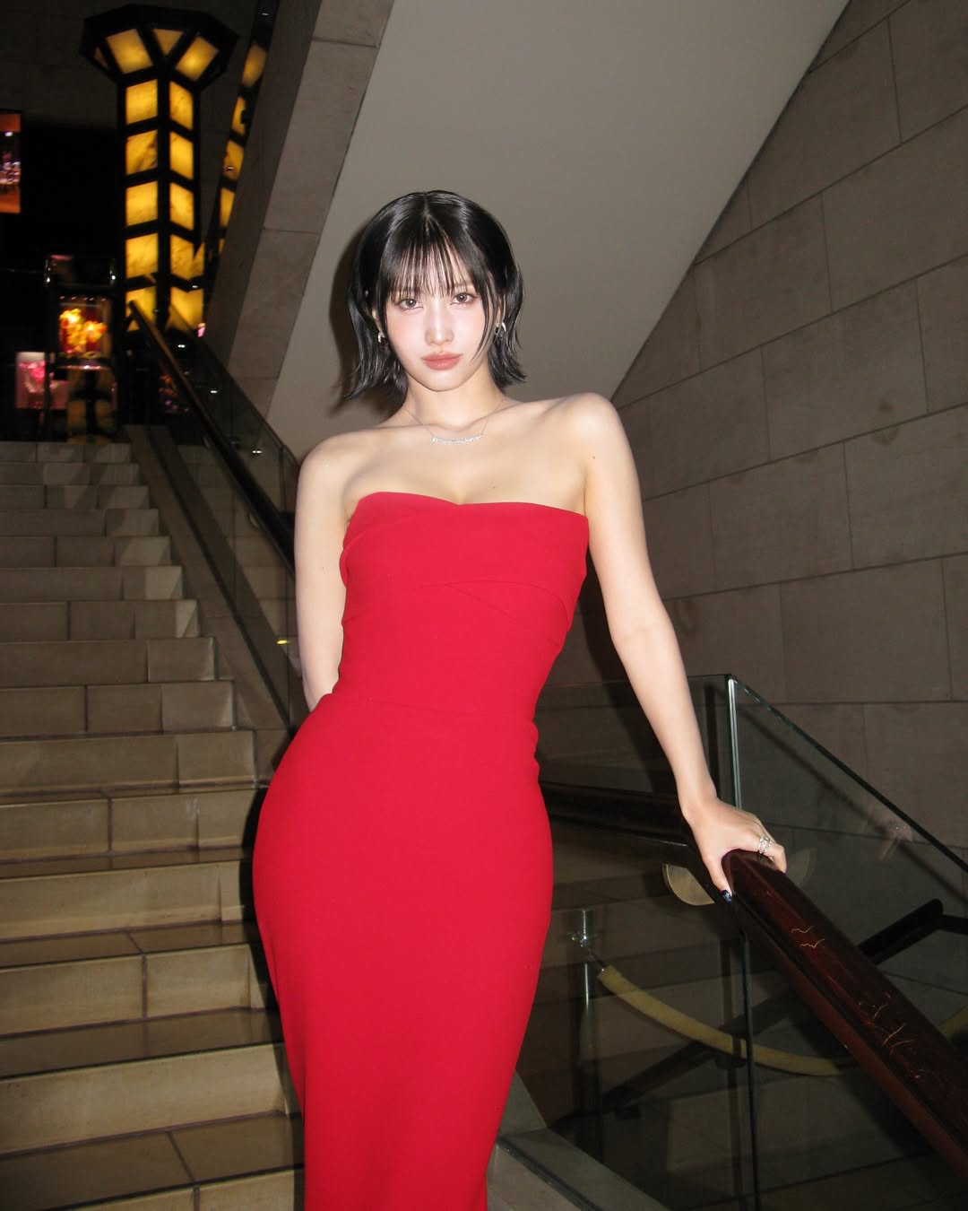 公開された写真のモモは鮮やかな赤のオフショルダー・マーメイド・ドレスを着ていて、流れるようなボディラインに沿ったドレスのシルエットが目を引く。