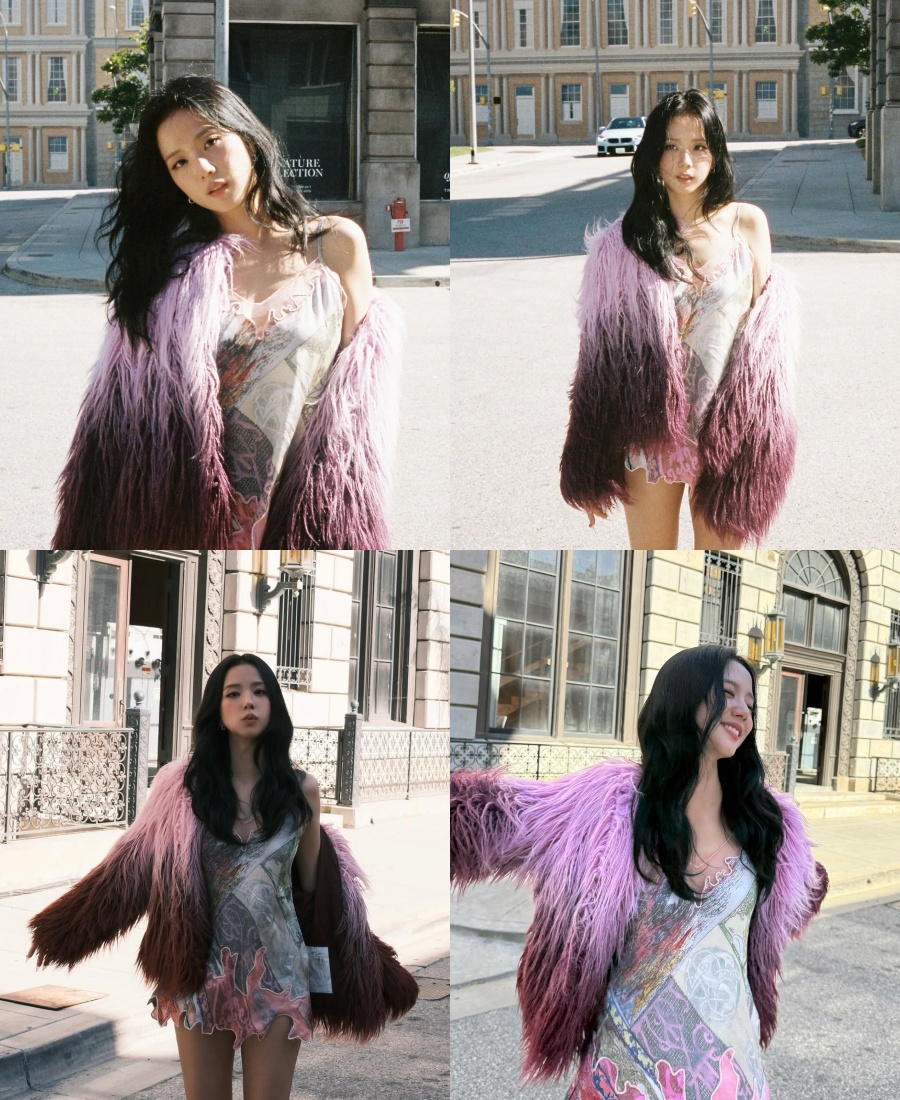 公開された写真を見ると、ジスは独特な柄のシルクのミニワンピースを着て、グラデーションが入ったピンク系のファージャケットを羽織っており、目を引く。濃いワインレッドと淡いピンクが混ざったファージャケットは、ジスの魅惑的な雰囲気を一段と際立たせており、ミニマルな衣装のシルエットと調和をなし、ゴージャスで自由なムードを漂わせている。