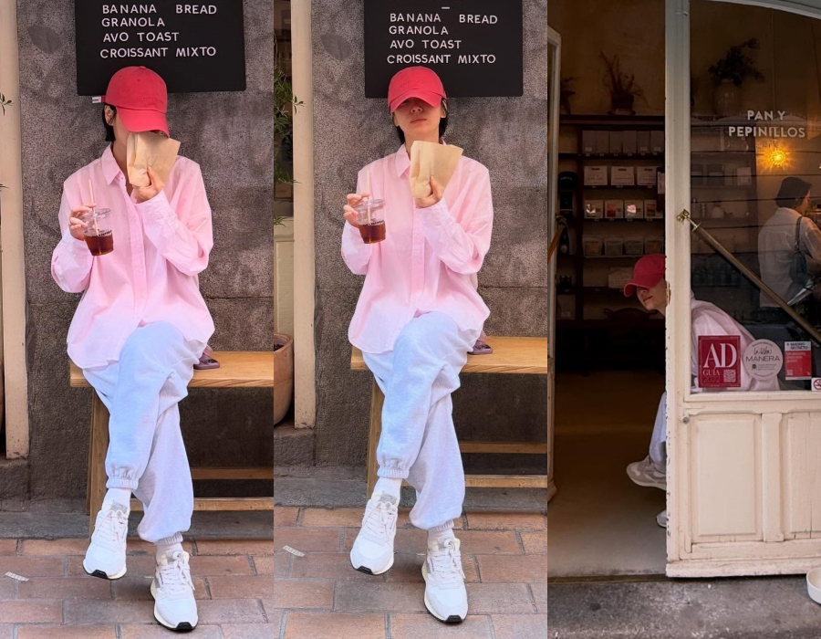 続く写真では、オーバーサイズのピンクシャツにグレーのジョガーパンツ、そしてスニーカーを合わせたリラックス感のあるスタイリングを披露。赤いキャップとコーヒーがアクセントとなり、余裕ある旅行者の雰囲気を醸し出していた。