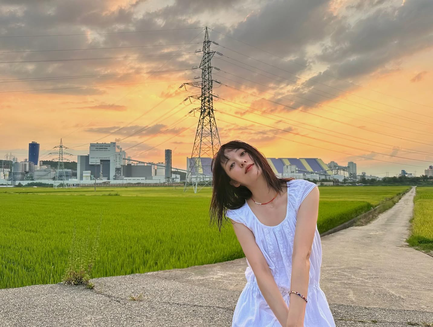 一方、白いワンピースを着て夕日が沈む野原に立っている写真では、清純な魅力を振りまいた。