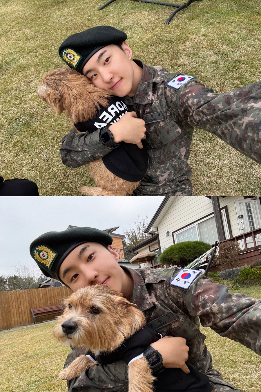 写真のホシは軍服を着て子犬を抱いている。ベレー帽と軍服もよく似合っていて、ほっこりするビジュアルに感嘆の声が上がっている。