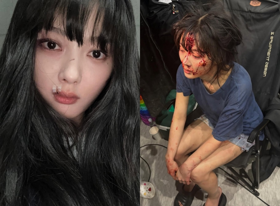 公開された写真はTVINGオリジナルシリーズ『親愛なるX』の撮影オフショットだ。キム・ユジョンの顔には血のりがベッタリと付き、片側には大きなガーゼが貼られており、ショッキングな姿だ。同ドラマで演じているアジンという役に対する情熱が目を引く。