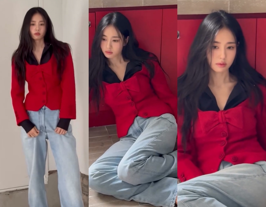 アン・ウンジンはグラビア撮影で赤いジャケットに黒いシャツ、そしてゆったりしたライトブルーのジーンズを合わせ、力を抜いたようなナチュラルシックなムードを演出した。リラックスした印象のジーンズと鮮やかな赤の対比が程よいアクセントとなり、淡白で感性的な雰囲気が際立っていた。