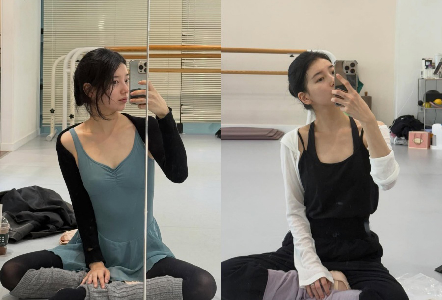床に座ってストレッチをしながら鏡を見つめる姿も目を引く。複雑なポーズではなくただ座っているだけなのだが、かすかな照明と静かなレッスン室が調和をなし、1カット1カットがまるでグラビアのようだ。