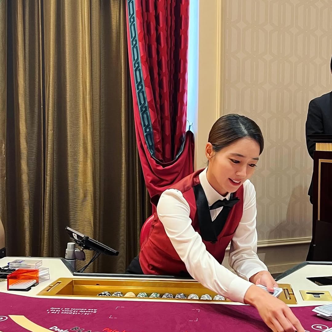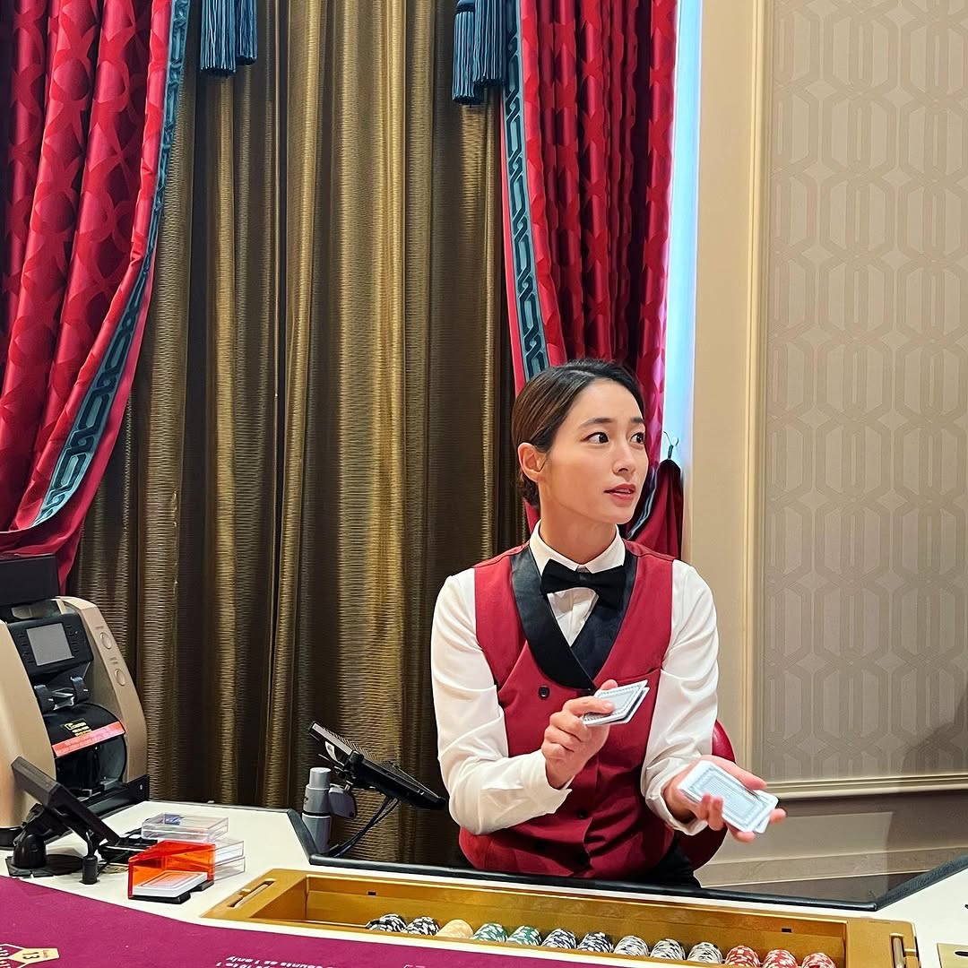 写真のイ・ミンジョンは、カジノテーブルの前でディーラーの服装をして、カードをシャッフルしながら余裕に満ちた笑顔を見せている。本物のカジノディーラーと見間違えるほど自然なポーズと表情が目を引く。