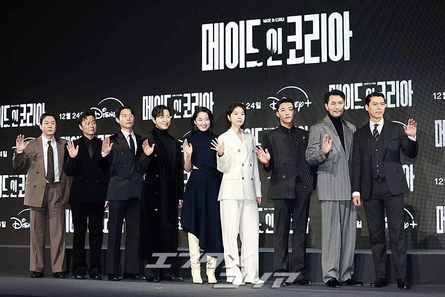 ウ・ミンホ監督をはじめ、俳優ヒョンビン、チョン・ウソン、ウ・ドファン、ソ・ウンス、ウォン・ジアン、チョン・ソンイル、カン・ギルウ、ノ・ジェウォン、パク・ヨンウらが15日午前、ソウル市内のホテル「グランド・インターコンチネンタル・ソウル・パルナス」で行われたDisney+オリジナル・シリーズ『メイド・イン・コリア』の制作発表会に出席し、記念撮影をした。