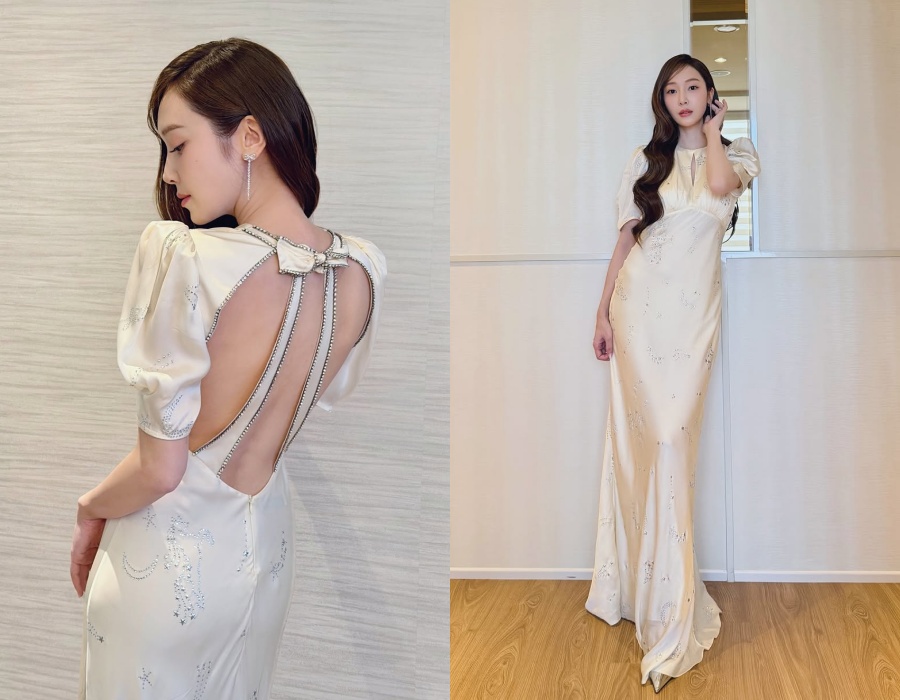 公開された写真でジェシカは、パフスリーブが目を引くアイボリーのドレスを着て壁に寄り掛かっている。前から見ると控えめなシルエットと上品な雰囲気だが、後ろから見ると大きく開いたバックレス・デザインとストラップの装飾で、背中のラインがあらわになっている。振り向いた側面の写真では、露出と上品さが同時に生きている。