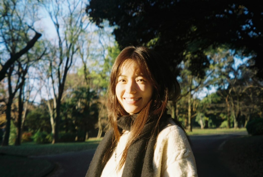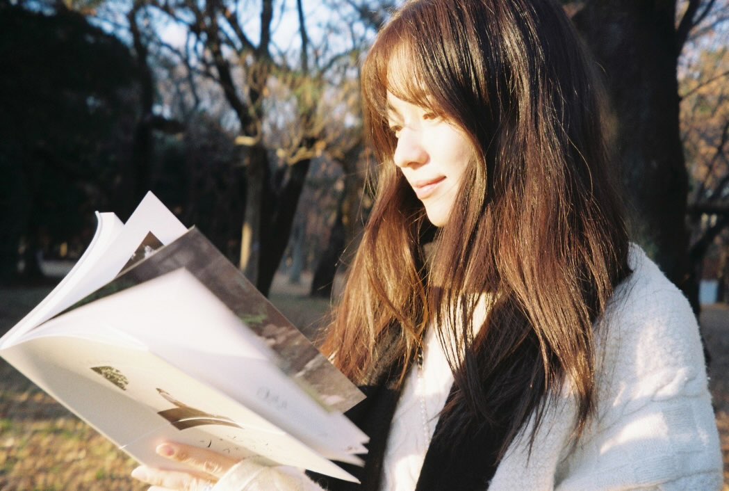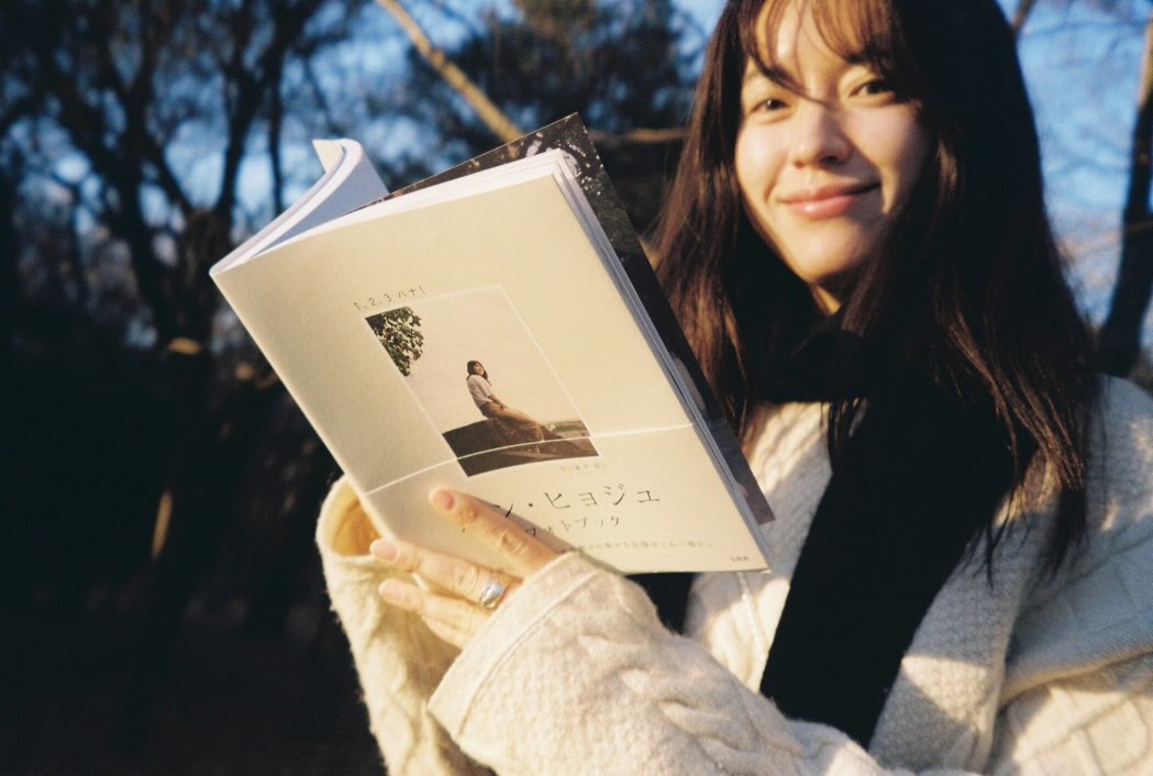 写真のハン・ヒョジュは本を手に笑顔を見せている。スッピンのようだがスッキリとした顔立ちが際立ち、日差しを浴びて清楚そのものという印象だ。