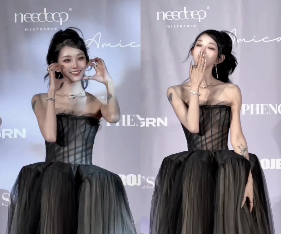 ウエストラインを強調したコルセットとフレアたっぷりのスカートというドレス姿で、手ハートに投げキスまで見せた。このドレスのブランドも「完璧に着こなしてくださいました。本当にとてもきれいです」と感嘆の声を上げた。