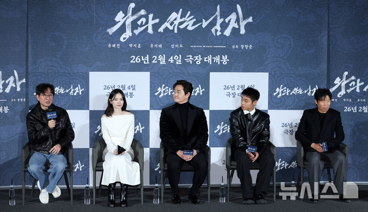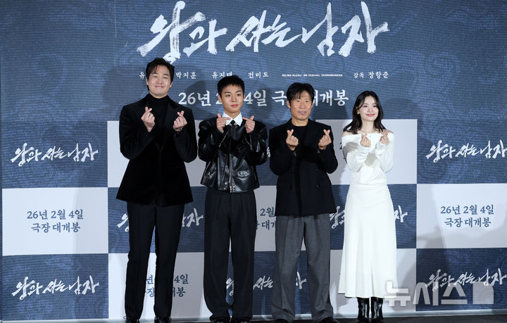 ユ・ジテ(写真左から)、パク・ジフン、ユ・ヘジン、チョン・ミド、チャン・ハンジュン監督が19日午前、ソウル市竜山区の映画館「CGV竜山アイパークモール」で行われた映画『王と生きる男』の制作報告会に出席した。