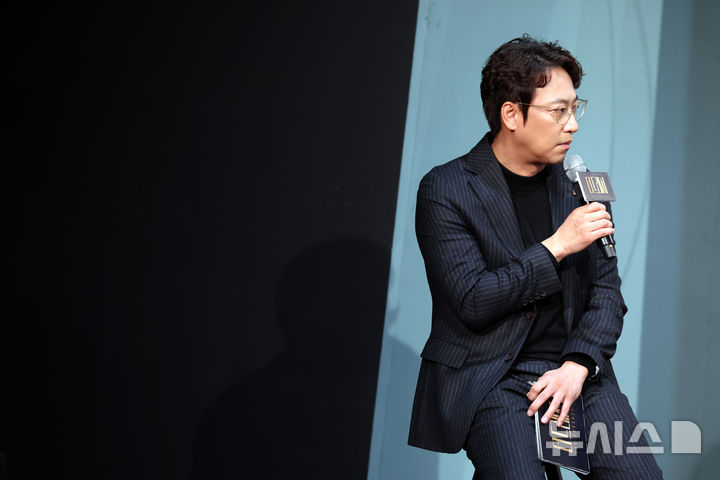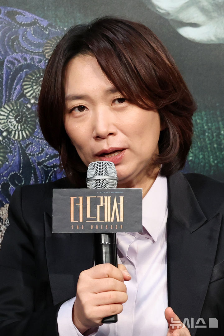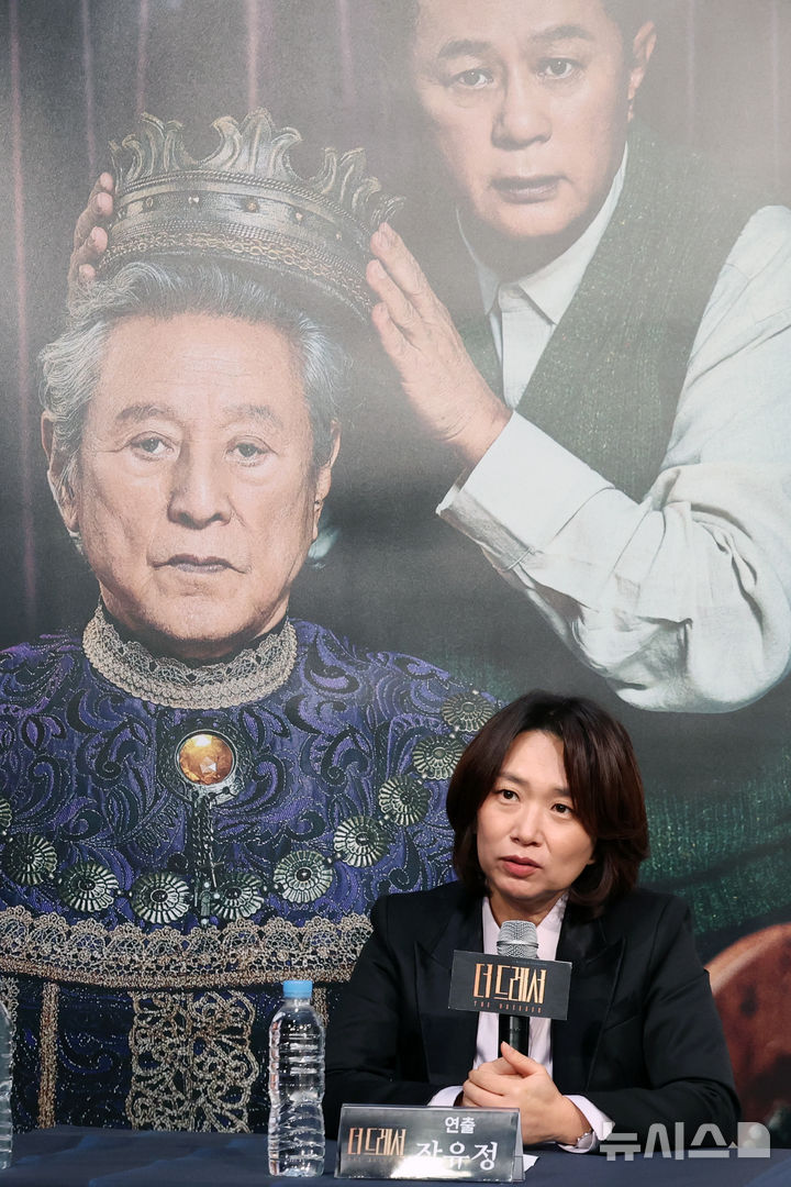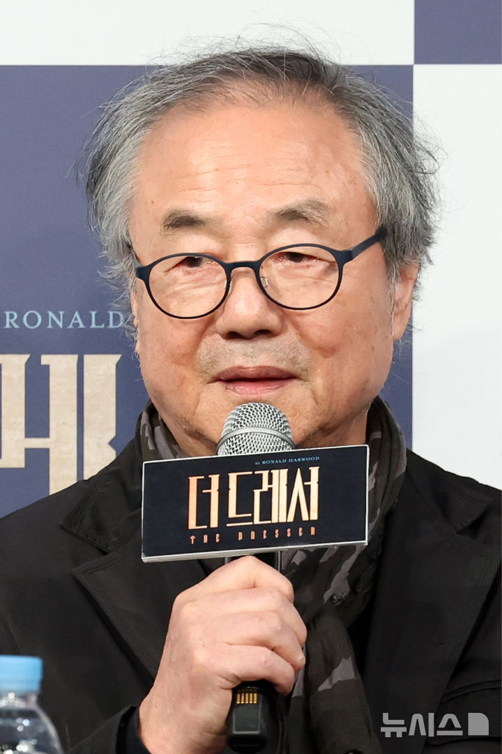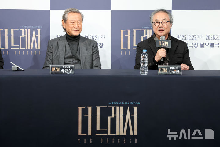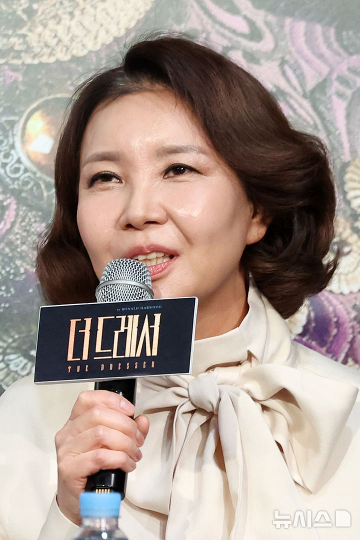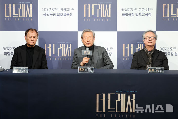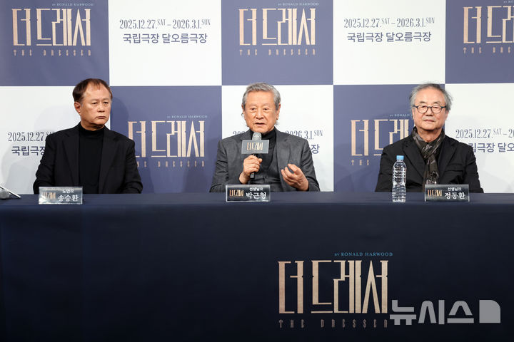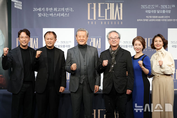 舞台『ザ・ドレッサー』に出演する俳優オ・マンソク、ソン・スンファン、パク・クニョン、演出チャン・ユジョン、俳優チョン・ドンファン、ソン・オクスク、チョン・ジェウン(写真左から)が19日、ソウル市鍾路区大学路のYES24ステージで記者懇談会を行っているところ。