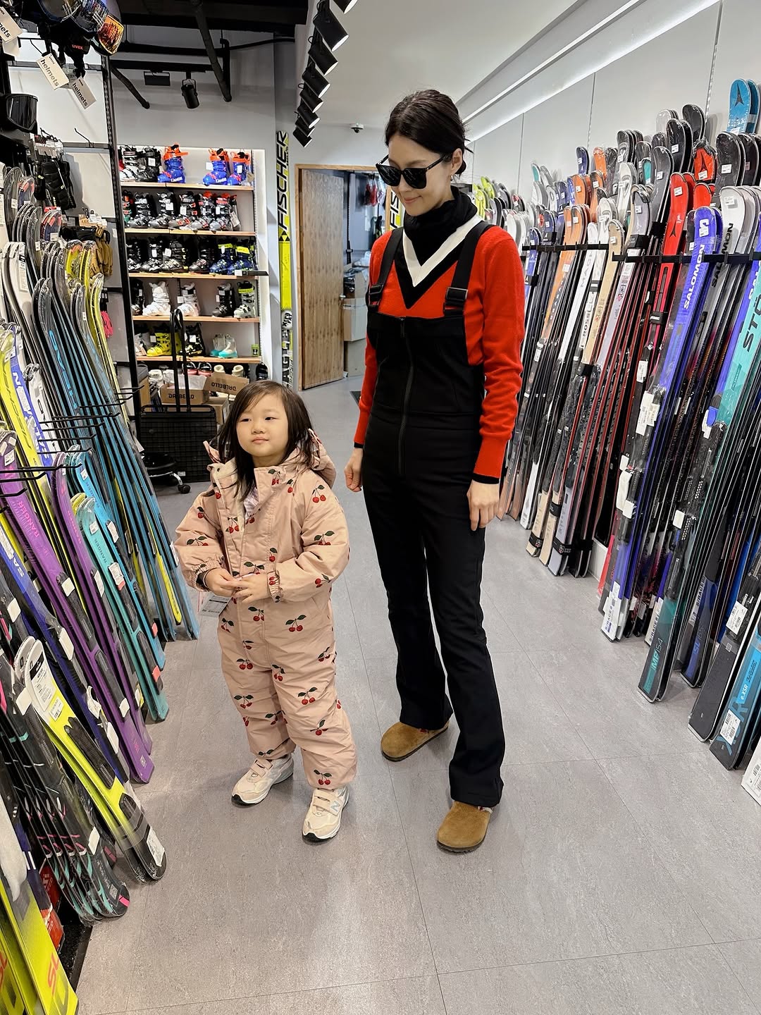 写真でハン・ジヘは、娘と一緒にスキー板を選んでいる。