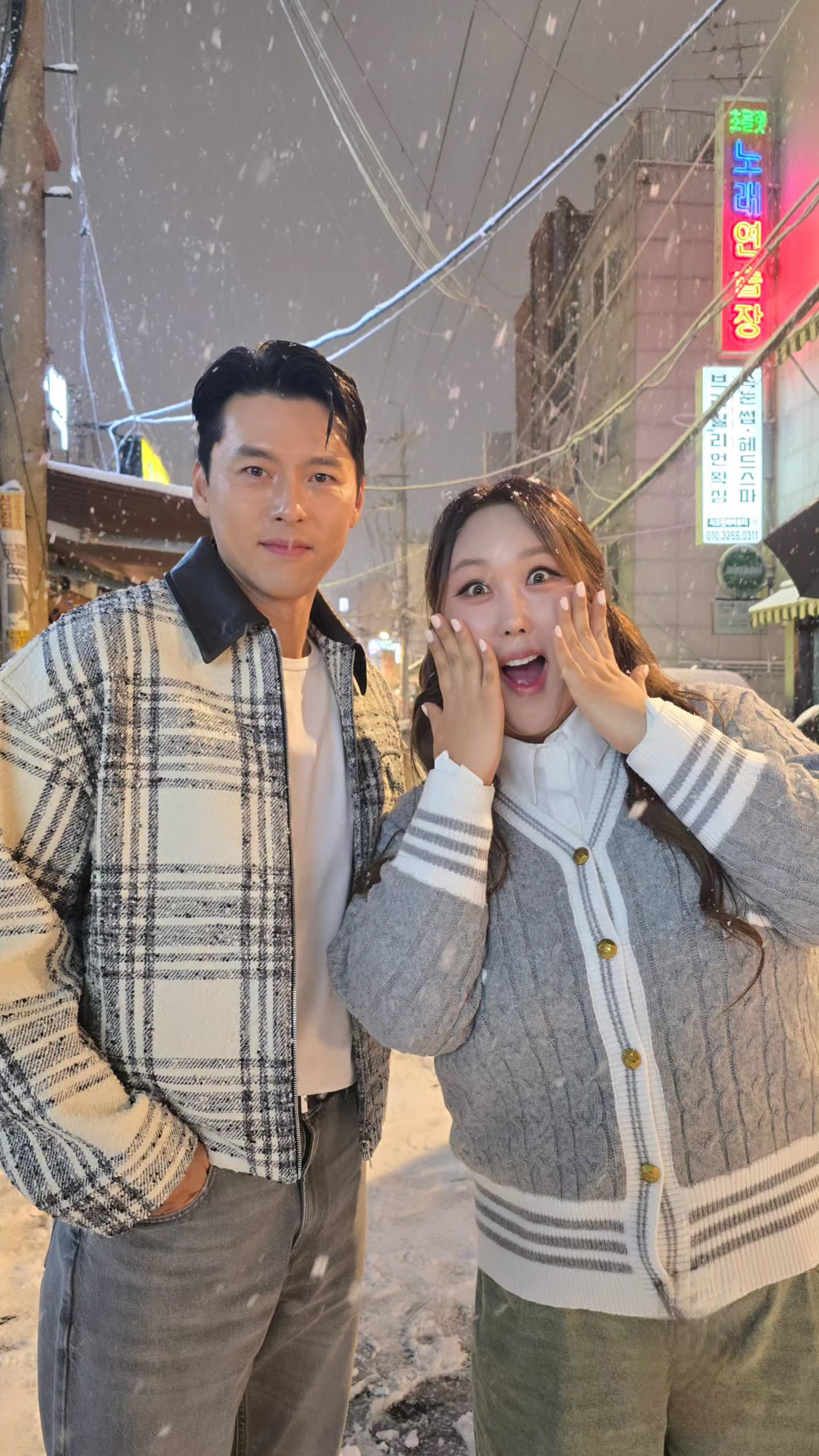 公開された写真を見ると、雪が降る中、プンジャがヒョンビンと仲良くポーズを取っている。プンジャは一段とスリムになった顔をアピール。白いシャツの上にグレーのカーディガンを着ている。