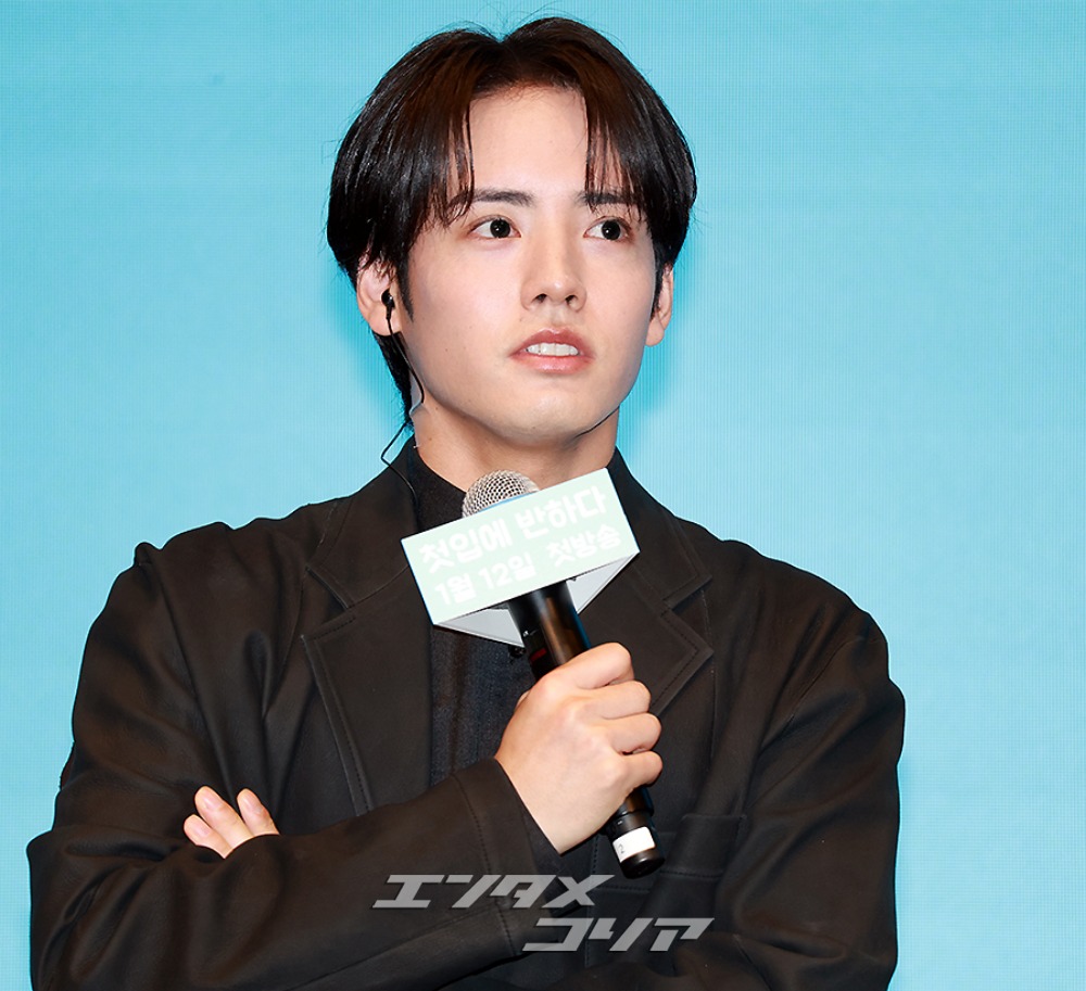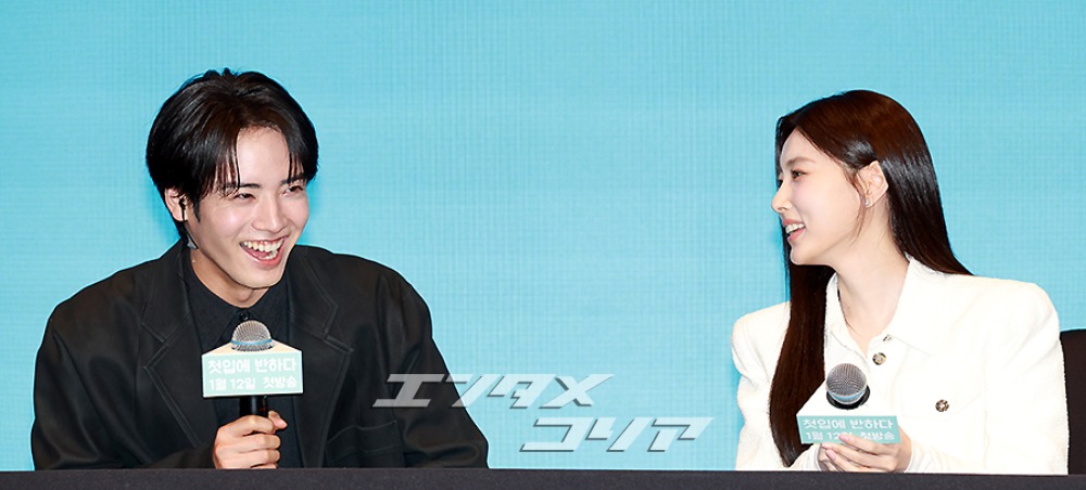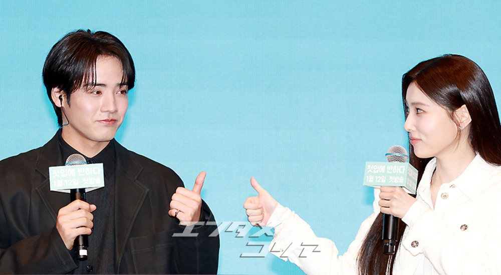 日本の俳優・赤楚衛二(写真左)とIZ*ONE出身の女優カン・ヘウォンが7日、ソウル市九老区新道林洞のザ・セイント・ウエディングで開かれた、テレビ東京系のドラマプレミア23枠で放送予定の『キンパとおにぎり〜恋するふたりは似ていてちがう〜』の制作発表会でポーズを取っている様子。