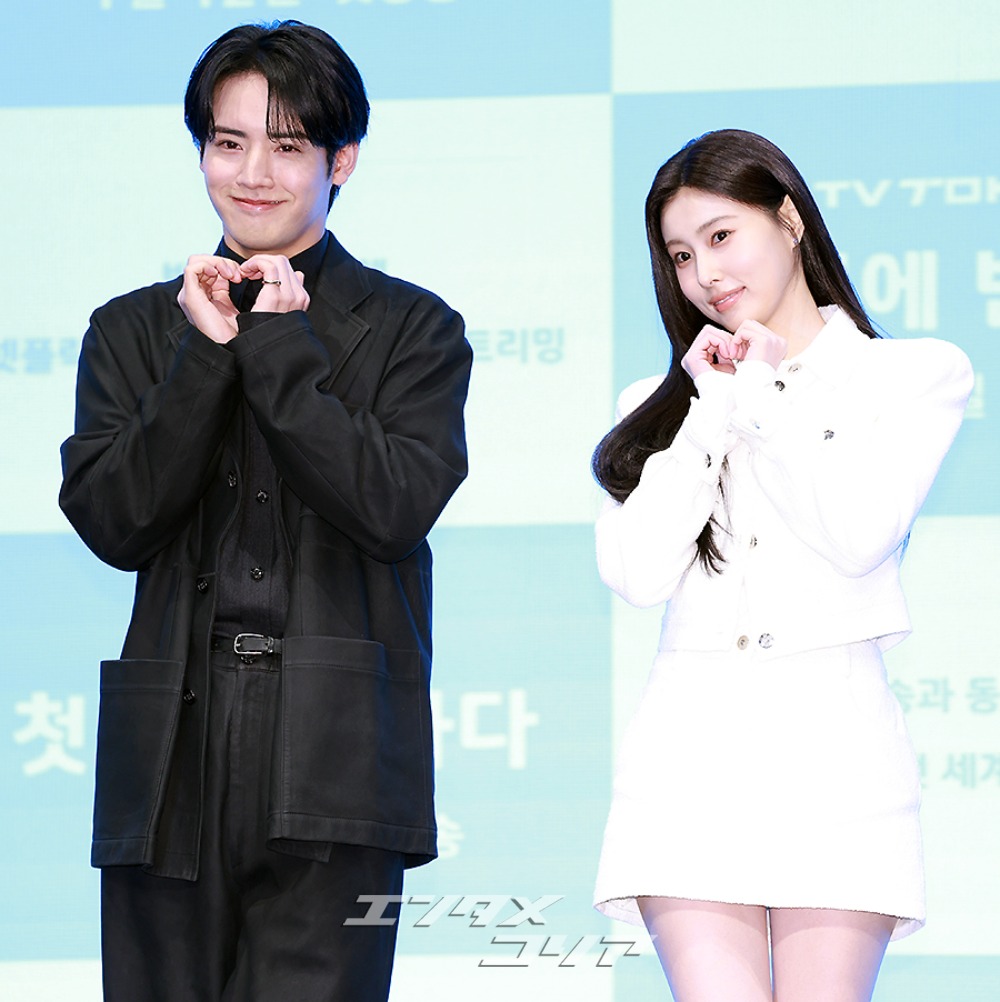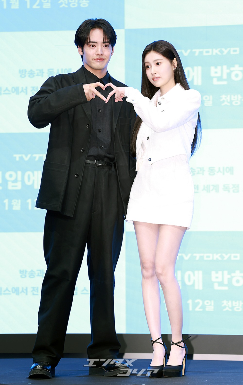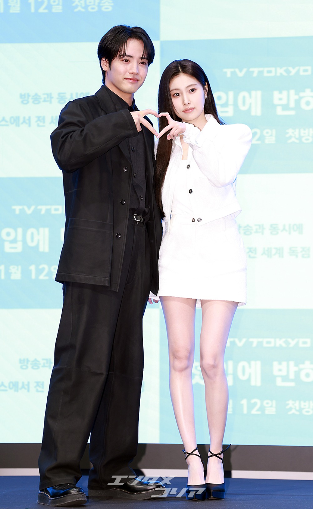 日本の俳優・赤楚衛二(写真左)とIZ*ONE出身の女優カン・ヘウォンが7日、ソウル市九老区新道林洞のザ・セイント・ウエディングで開かれた、テレビ東京系のドラマプレミア23枠で放送予定の『キンパとおにぎり〜恋するふたりは似ていてちがう〜』の制作発表会でポーズを取っている様子。