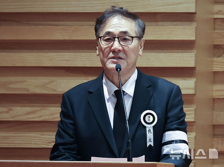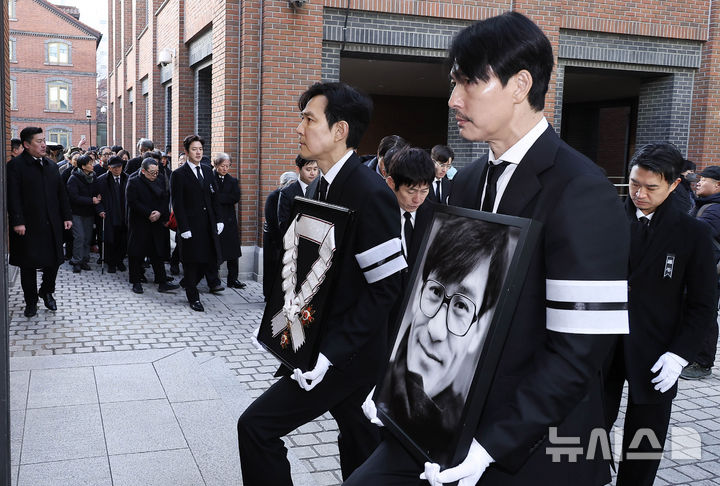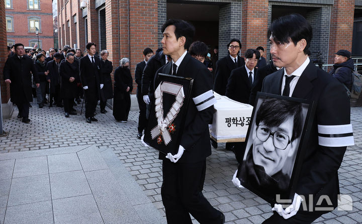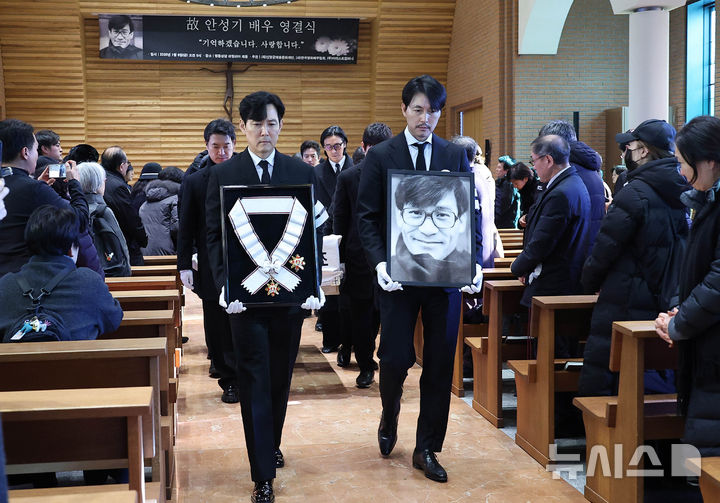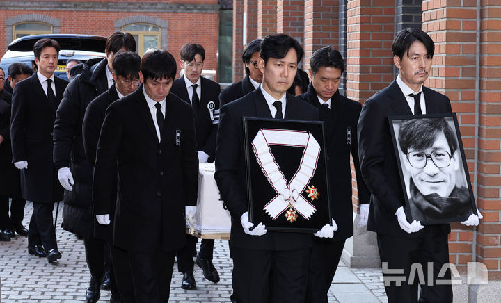 【NEWSIS】9日午前、ソウル市中区の明洞聖堂で、故アン・ソンギさんの告別式を終えて遺族や同僚俳優らが聖堂を出る様子。