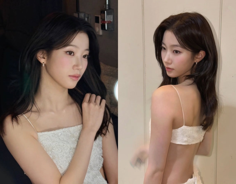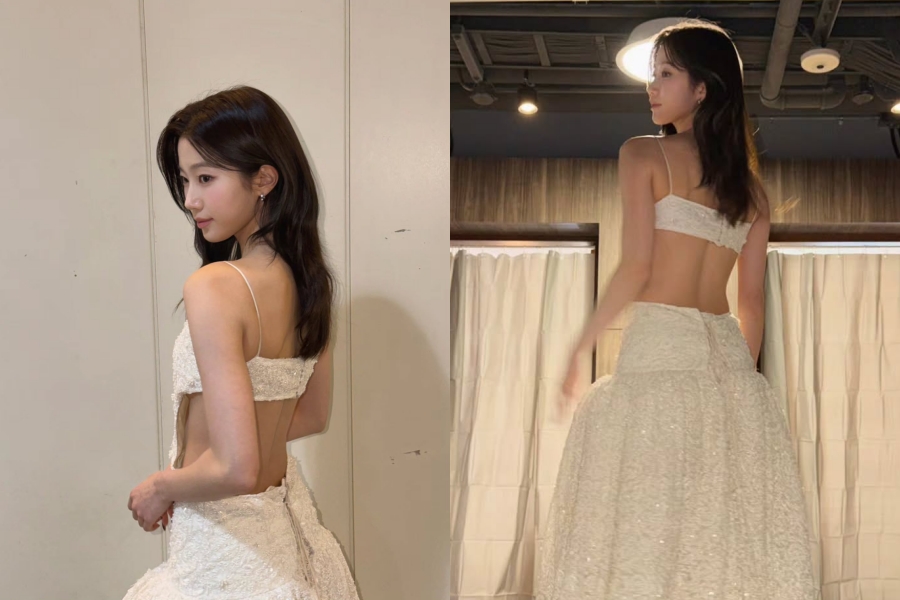公開された写真を見ると、カズハは背中があらわになった白いドレスを着て、清純かつセクシーなビジュアルを誇っている。ぜい肉一つなくスリムなスタイルで思い切ったデザインのドレスを着こなすカズハは、前から見た上品な雰囲気とは正反対の大胆な後ろ姿を披露し、人々の目を奪った。