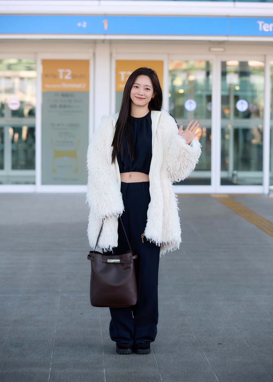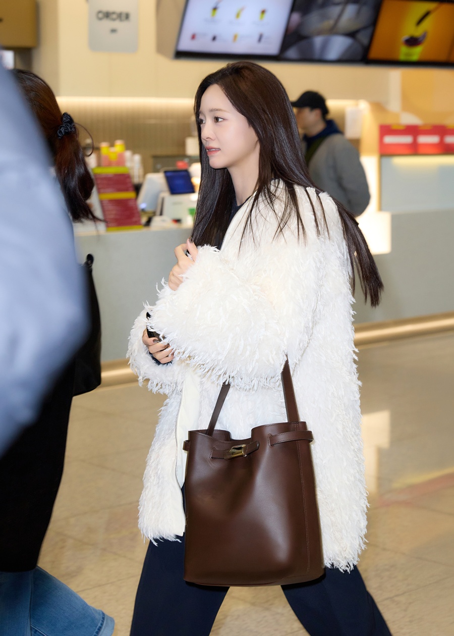 この日、キム・セジョンはアイボリー色のファーコートに黒いパンツとブーツを合わせ、対照的な色彩感が際立つスタイリングを披露した。さらに、ブラウンのショルダーバッグをポイントにし、真冬のフライトコーデの定番をつくり上げてみせた。