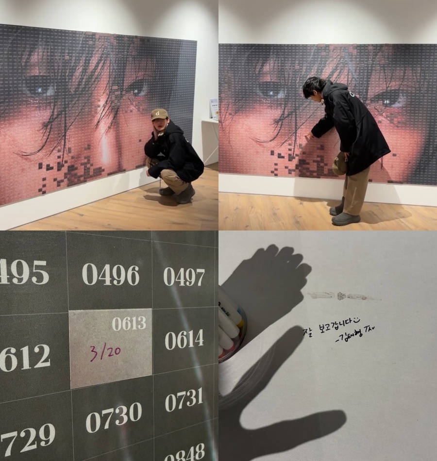 公開された写真を見ると、Vは展示された写真を眺めたり、携帯電話のカメラで撮影したりしている。また、設置されたメッセージボードにファンたちが書き残したメッセージを読んだり、デビュー日を連想させる数字の欄にカムバック日「3/20」を自分で書き込んだりもした。芳名帳には「楽しませてもらいましたーキム・テヒョン」と書いており、目を引く。