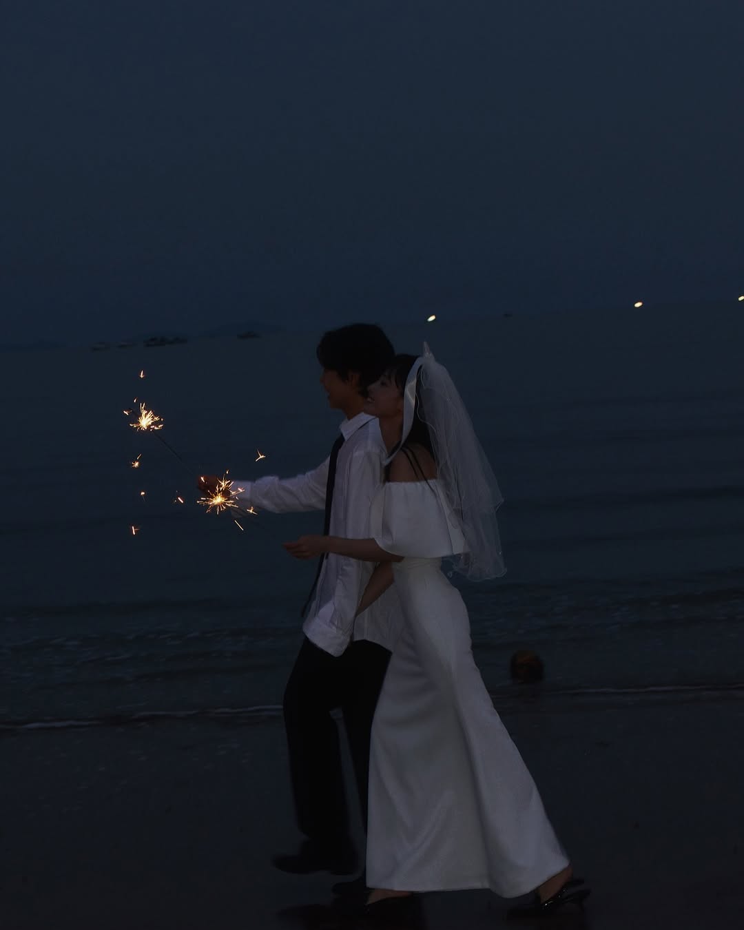 あわせて公開されたウエディング写真には、ソム・へビンとキム・イェフンが夕暮れの海辺でスパークラーを手に、ロマンチックな雰囲気を漂わせている。