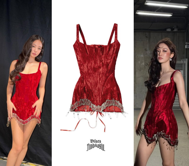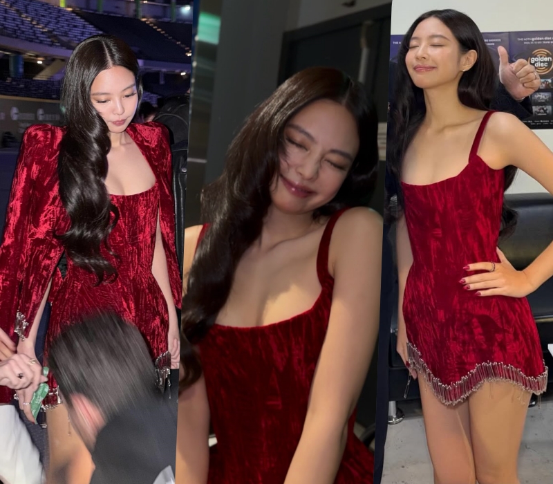 ジェニーは台湾・台北で開催された第40回ゴールデンディスクアワードに、クラシカルで魅惑的な雰囲気のベルベット素材の赤いミニドレス姿で登場した。ボディラインに沿って流れるようなベルベットの質感と、裾にあしらわれた華やかなメタルタッセル装飾が特徴のアイテムで、ジェニーは魅惑的な美しさを誇っていた。